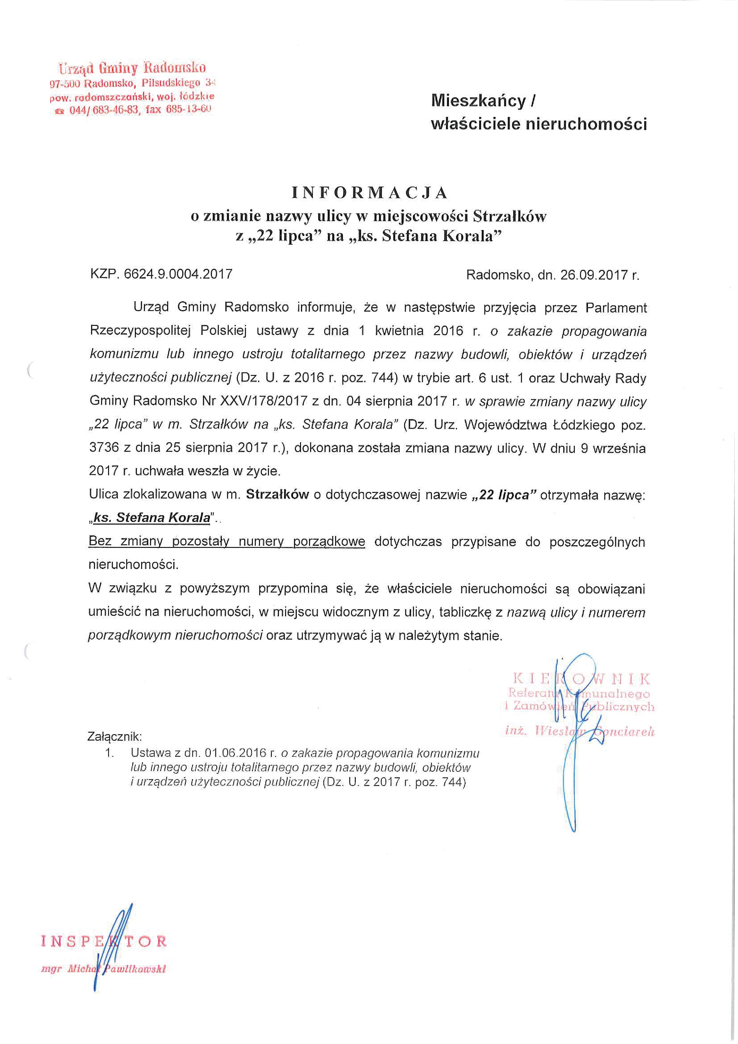 dnia 1 grudnia 2017 r. (piątek) o godz. 11:00 w siedzibie Urzędu Gminy Radomsko, ul. Piłsudskiego 34