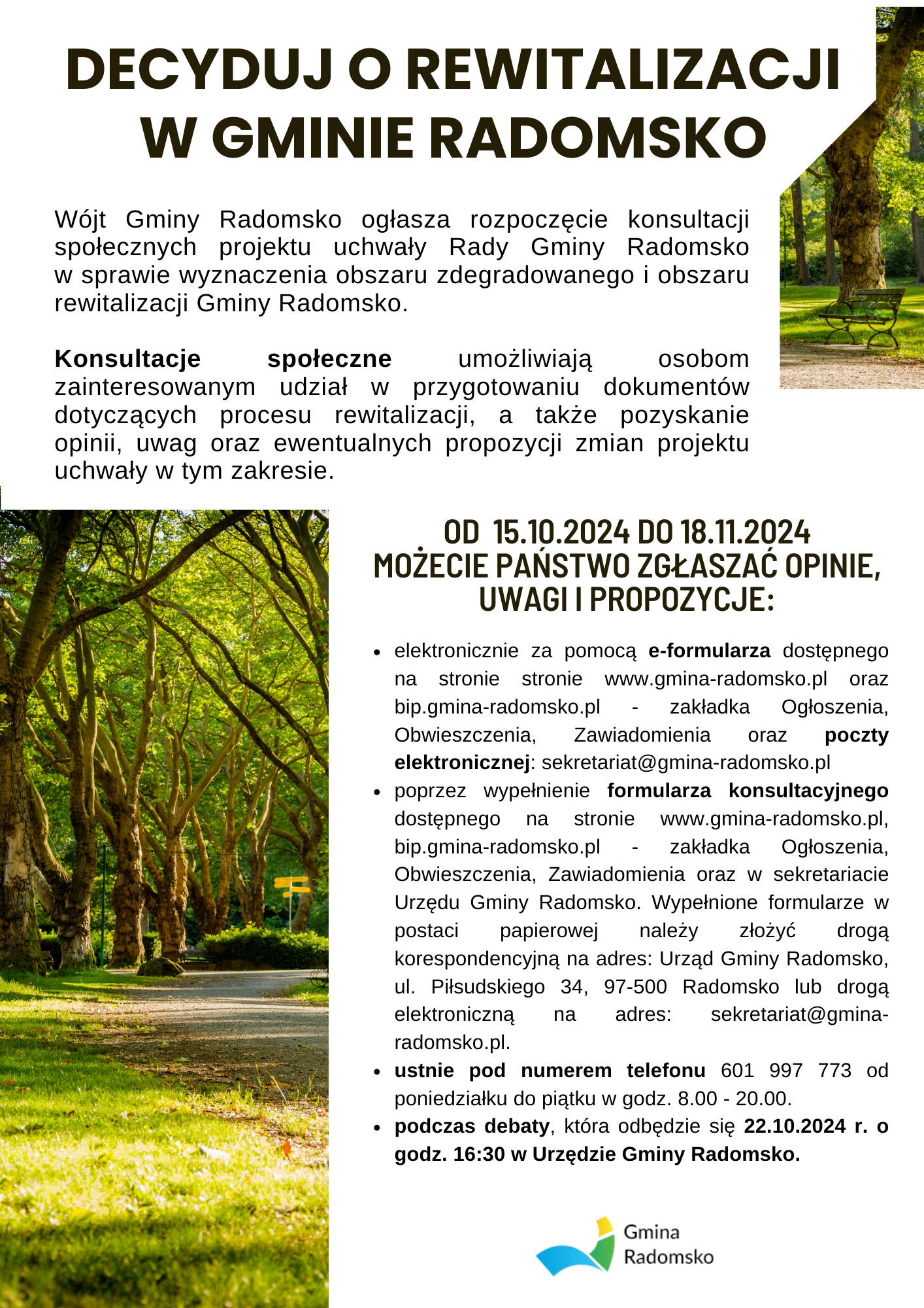 Wójt Gminy Radomsko, na podstawie art. 6 ust. 1 i ust. 2 oraz art. 11 ust. 3 ustawy z dnia 9 października 2015 r. o rewitalizacji (Dz. U. z 2024 r., poz. 278) powiadamia o rozpoczęciu konsultacji społecznych projektu Gminnego Programu Rewitalizacji dla Gminy Radomsko na lata 2025-2030